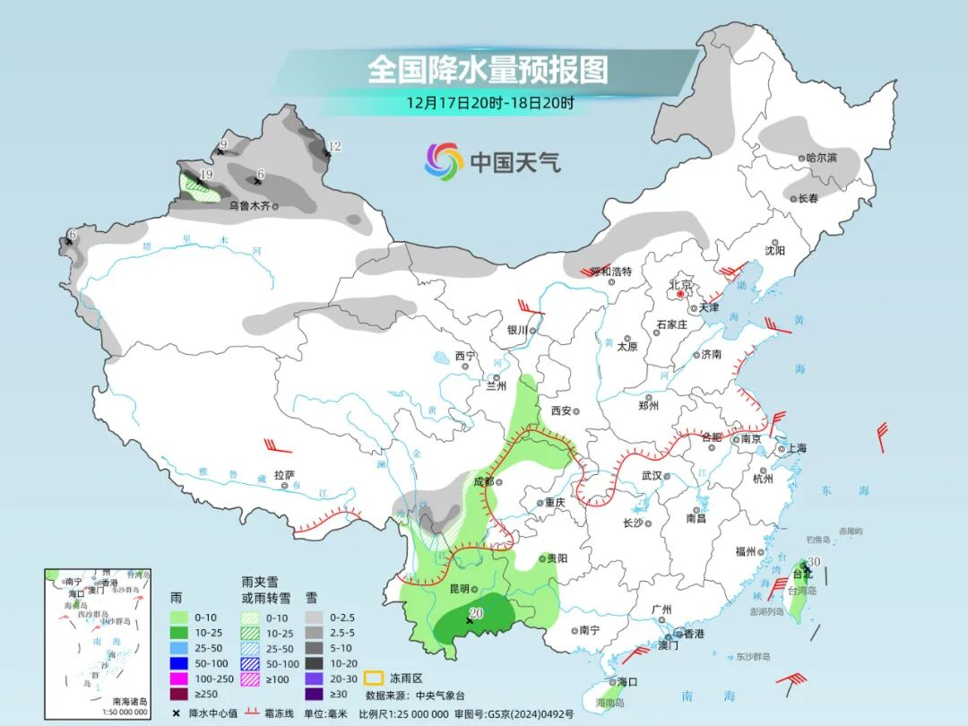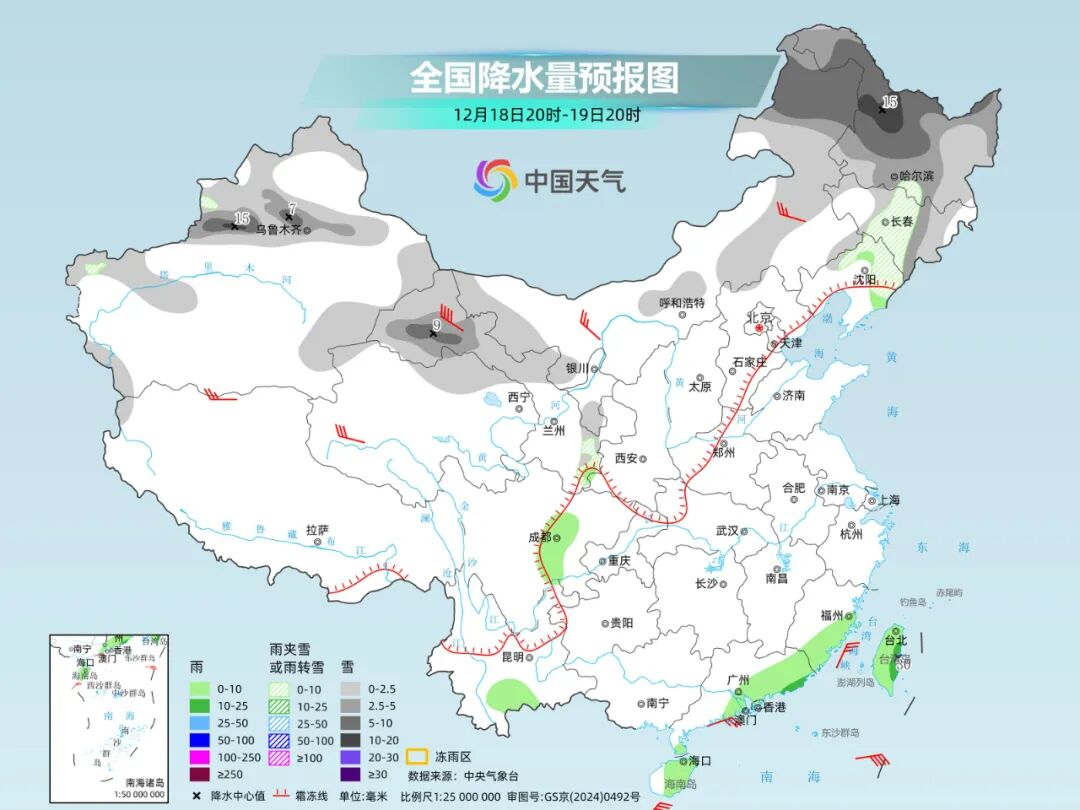 后天,降雪的范围继续向东扩展,内蒙古东北部、黑龙江中北部等地部分地区有大雪、局地暴雪。南方降雨的范围也会有所扩张,福建、广东等地多有小雨,局地有中雨或大雨。