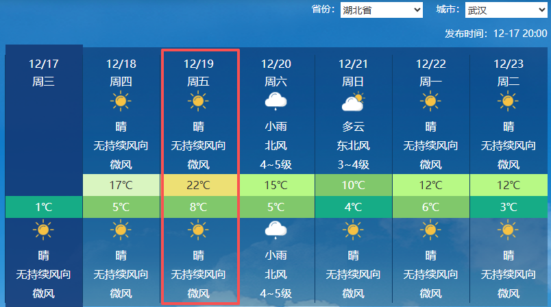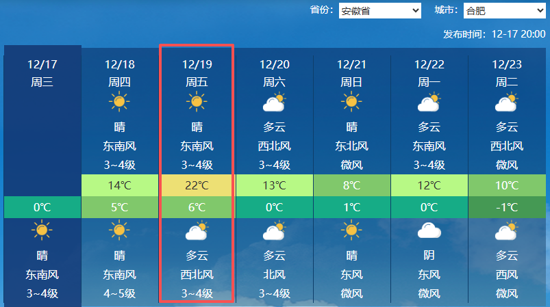这种大幅偏暖不算多见。像是合肥,当地12月中旬气温历史极值为21.2℃,武汉为20.5℃。根据最新预报,合肥、武汉19日最高气温都可能达到22℃,打破当地极值纪录。