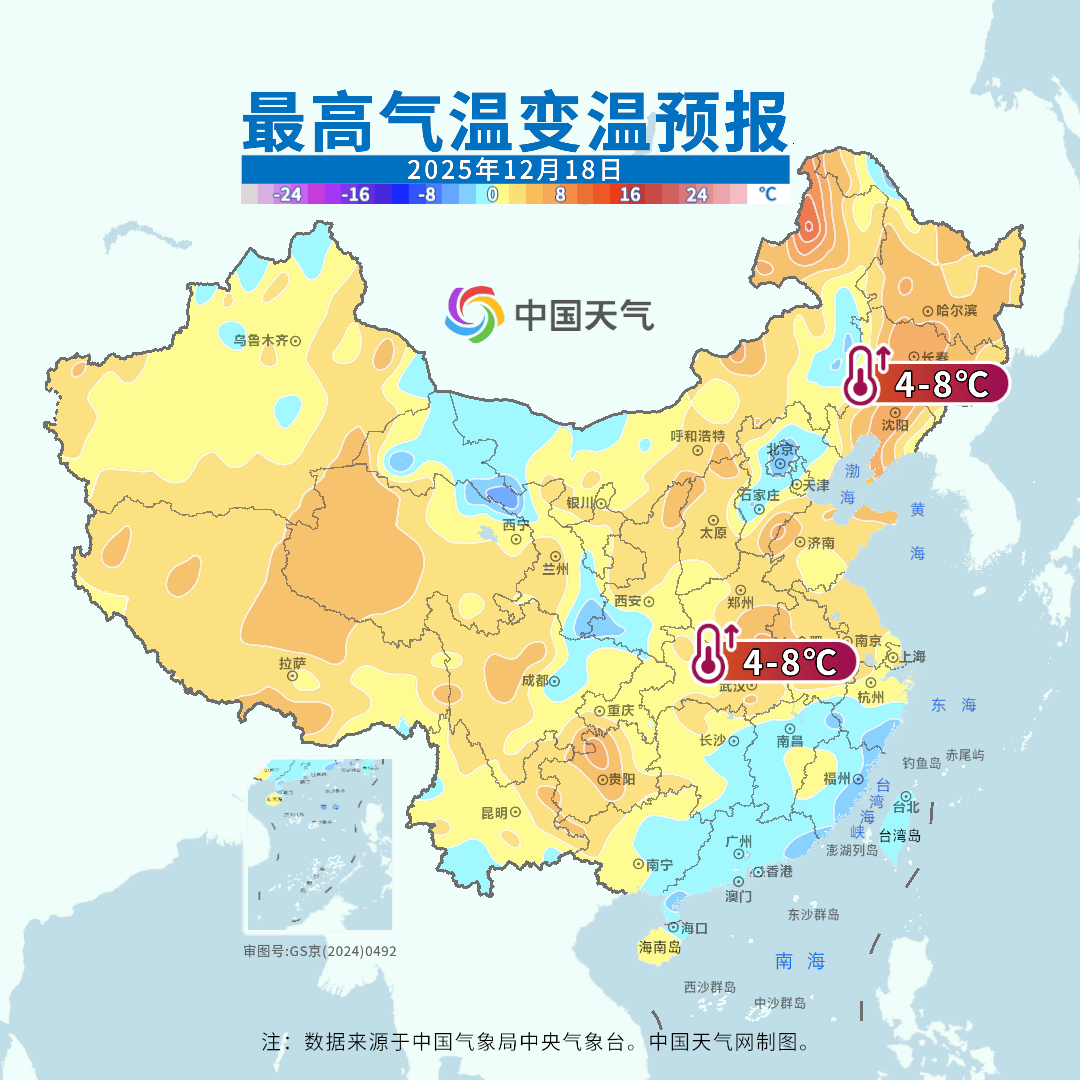 明后两天,中东部气温的回升将陆续迎来高潮。特别是本周五,长江中下游等地一些地方最高气温都能冲到20℃以上,局地还可能打破12月中旬气温极值。