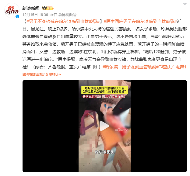近日,黑龙江哈尔滨中央大街就发生了惊险一幕:一名南方游客因未穿棉裤,在哈尔滨中央大街的寒夜中,腿部静脉曲张血管破裂。民警对其救助时,一边施救,一边道出关键:“在东北,出门必须穿上棉裤!”