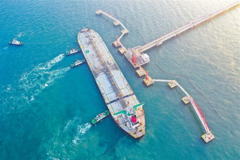12月18日,一艘装载着17.9万吨石化原辅料的船舶泊入国投洋浦油储码头30万吨级原油泊位(无人机照片)。新华社记者 郭程 摄