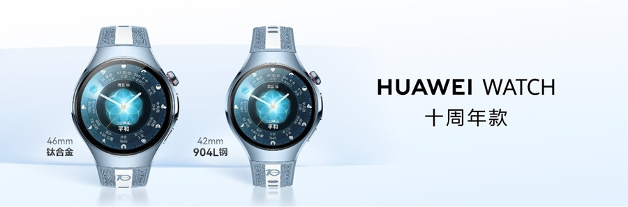 华为WATCH十周年款是华为重磅发布的具有里程碑意义的十周年力作。新品外观采用穹宇蓝与极地白交织专属配色,42mm和46mm两种表径可选,表冠有“10 YEARS”丝印,以细节致敬十年探索。