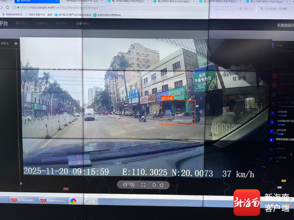 今年以来,海口数字化城市管理指挥监督中心与网约车平台进行合作,通过调取网约车的车载摄像头录像,智能甄别出道路上无照经营游商、非机动车乱停放、路灯缺亮等等一系列问题。“网约车路径几乎覆盖整个城区,是一双非常好的‘眼睛’。”赵斌说道,视频画面抓取出来后,实时转由相关职能部门及时处理,实现自动化立案派发。