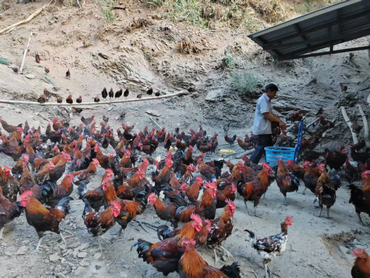 为了让农家乐有“料”,2021年,黄金村股份合作社建了林下养鸡场。第一批1500只“跑山鸡”,很快就被附近的农家乐和饭店“包圆”了。现在一年能卖5批,每只110元,村民跟着分红。