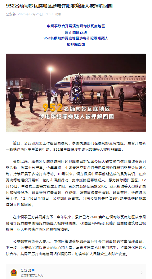 长期以来,缅甸妙瓦底赌诈园区的犯罪集团对我国公民大肆实施电信网络诈骗等犯罪活动,危害十分严重。今年年初,中缅泰建立联合打击电信网络诈骗犯罪部级协调机制,持续开展了多轮打击行动。10月以来,缅方根据中缅泰前期达成的系列共识,在妙瓦底等地组织开展新一轮打击清剿行动,集中抓捕犯罪嫌疑人,强力拆除赌诈园区。12月15日,中缅泰三国警方组成工作组,首次共赴妙瓦底地区KK、亚太新城等大型赌诈园区和相关场所,联合督导打击清剿工作成效,研究后续集中清剿、联合管控、快速遣返等工作。12月16日至19日,公安部组织吉林、河南公安机关将清剿行动中抓获的犯罪嫌疑人押解回国。