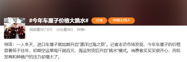 据央视网报道,明年1月到2月初,智利车厘子快件密集到达,市场供应到达顶峰。这时候到货的车厘子品质最高,价格比现在还能便宜三成。