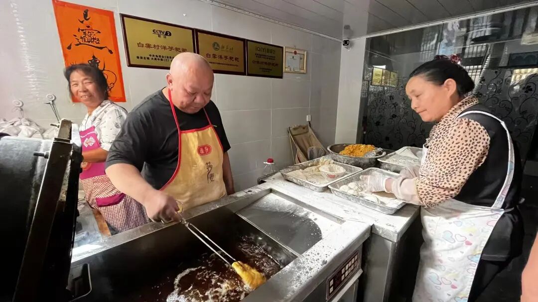 朱学贵(左二)在小吃店里炸洋芋粑粑。农民日报全媒体记者 刘学 摄