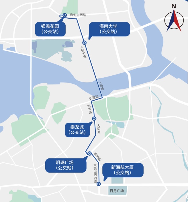 赛前接驳专线二路线为:银滩花园(公交站)—海南大学(公交站)—泰龙城(公交站)—明珠广场1号站(公交站)—新海航大厦(公交站)。05:20-06:20发车,05:20开始每3分钟发1辆车,05:40开始每2分钟发1辆车。