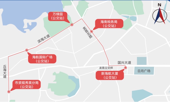 赛前接驳专线一路线为:市资规秀英分局(公交站)—海航国际广场(公交站)—万绿园(公交站)—海南税务局(公交站)—新海航大厦(公交站)。05:20-06:20发车,05:20开始每5分钟发1辆车,05:40开始每2分钟发1辆车。