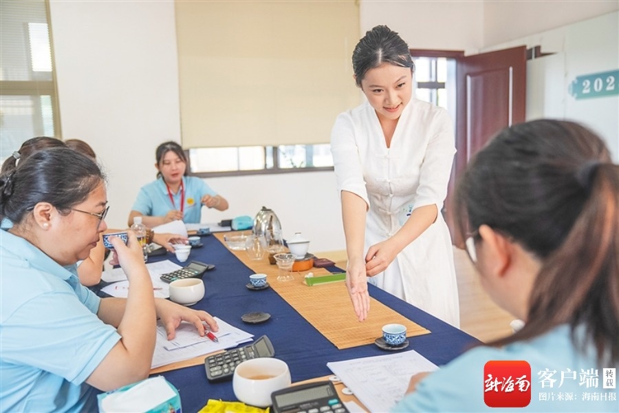 5月19日,在琼中黎族苗族自治县职工服务中心进行的茶艺师茶汤质量比拼项目中,茶艺师请评委品茶。方山 摄