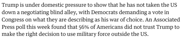 特朗普在国内面临双重政治压力:一方面,民主党人要求国会就其可能发起的对伊战争进行投票表决,反对美方贸然卷入中东冲突;另一方面,美联社民调显示,56%的美国人不相信特朗普政府能针对“境外使用武力”做出正确决定。