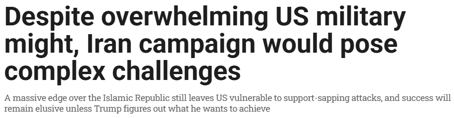 《以色列时报》网站的文章进一步分析指出,特朗普政府至今未明确对伊军事行动的核心目标和成功标准,成为其开展军事行动的最大障碍。
