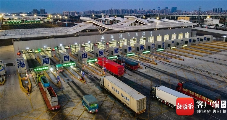 1月1日9时多,海口新海港和南港“二线口岸”(货运)集中查验场,满载热带果蔬的货车排起整齐长队,货车引擎的轰鸣、智能查验系统的叮咚提示音、工作人员对讲机里的指令声交织回荡,勾勒出一幅热火朝天的新年运输图景。