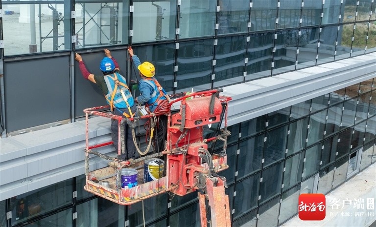 登高车伸展长臂,挖掘机轰鸣作业,工人们穿梭其间,忙着玻璃幕墙安装、室内精装修、园林绿化。敲打声、机器声、吆喝声,交织成一首奋进的交响曲。