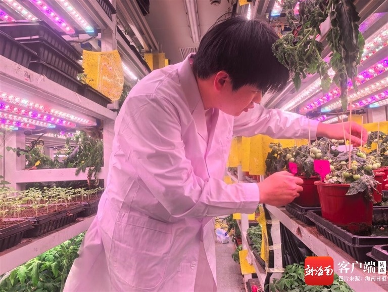 新年第一天,三亚崖州湾科技城高新区研学谷内一片宁静。浙江大学海南研究院设施蔬菜生长发育调控与绿色高效生产实验室内,该校助理研究员胡超轶正弯着腰查看置物架上的一株株番茄苗,架顶上红蓝灯光投射在他的身上,洒下片片光斑。