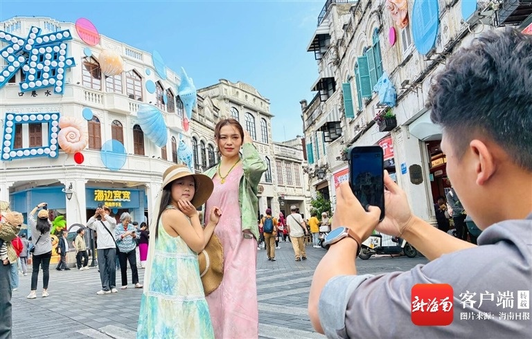 从特产店出来,走到水巷口,记者注意到,许多市民游客正兴致勃勃地和前几天换上的海口“新皮肤”合影——街口的3层小白楼墙体上,“海口”2个大字周围点缀着海螺、海星、贝壳等各种大型装饰性装置,俨然已成为新的网红打卡点。