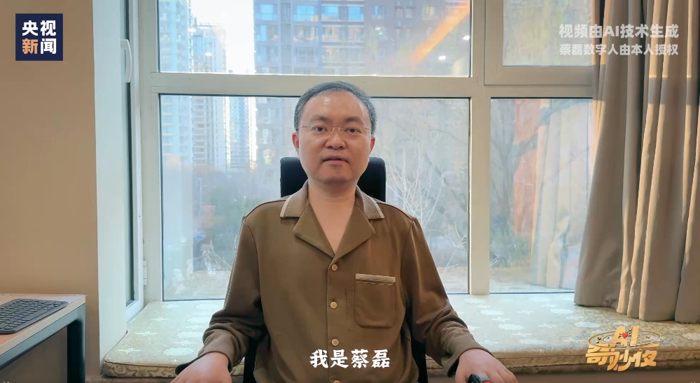 2024年12月31日,在央视新闻首台AIGC晚会《AI奇妙夜》上,蔡磊借助AI技术完成了一场演讲。视频截图