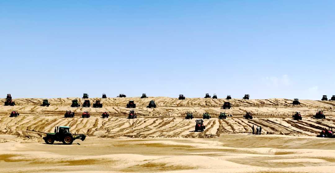 于田县结合沙丘地形特点,将20米至40米高的高大沙丘分段平整为“梯田”,在沙丘顶部种植乔灌草,斜坡处铺设草方格,沙丘底部栽种梭梭、红柳、酸枣等固沙植物。该县创新探索的“梯田治沙”模式,相较以往将沙丘整体平整后再种植防沙作物的方式,成本降低约80%。