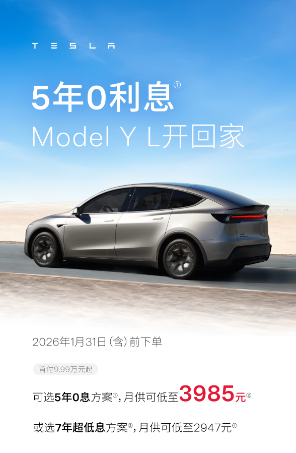 2026年1月6日,特斯拉中国率先发力,于1月6日首次推出限时超长期购车方案“特悠享”,覆盖Model 3、Model Y及Model Y L全系主力车型,通过7年超低息、5年0息等多元金融政策叠加多重补贴福利,进一步降低购车门槛,在白热化的车市竞争中展现深耕中国市场的决心。