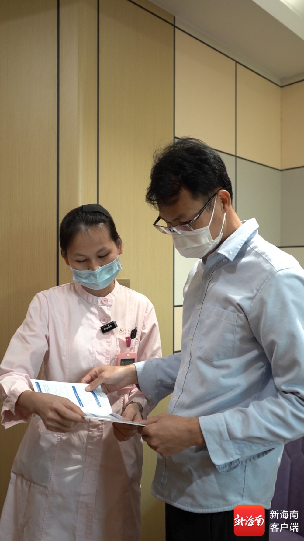 在海口市妇幼保健院,医护人员在给宝爸陈先生介绍有关新生儿免费参保的政策。记者 陈元能 摄