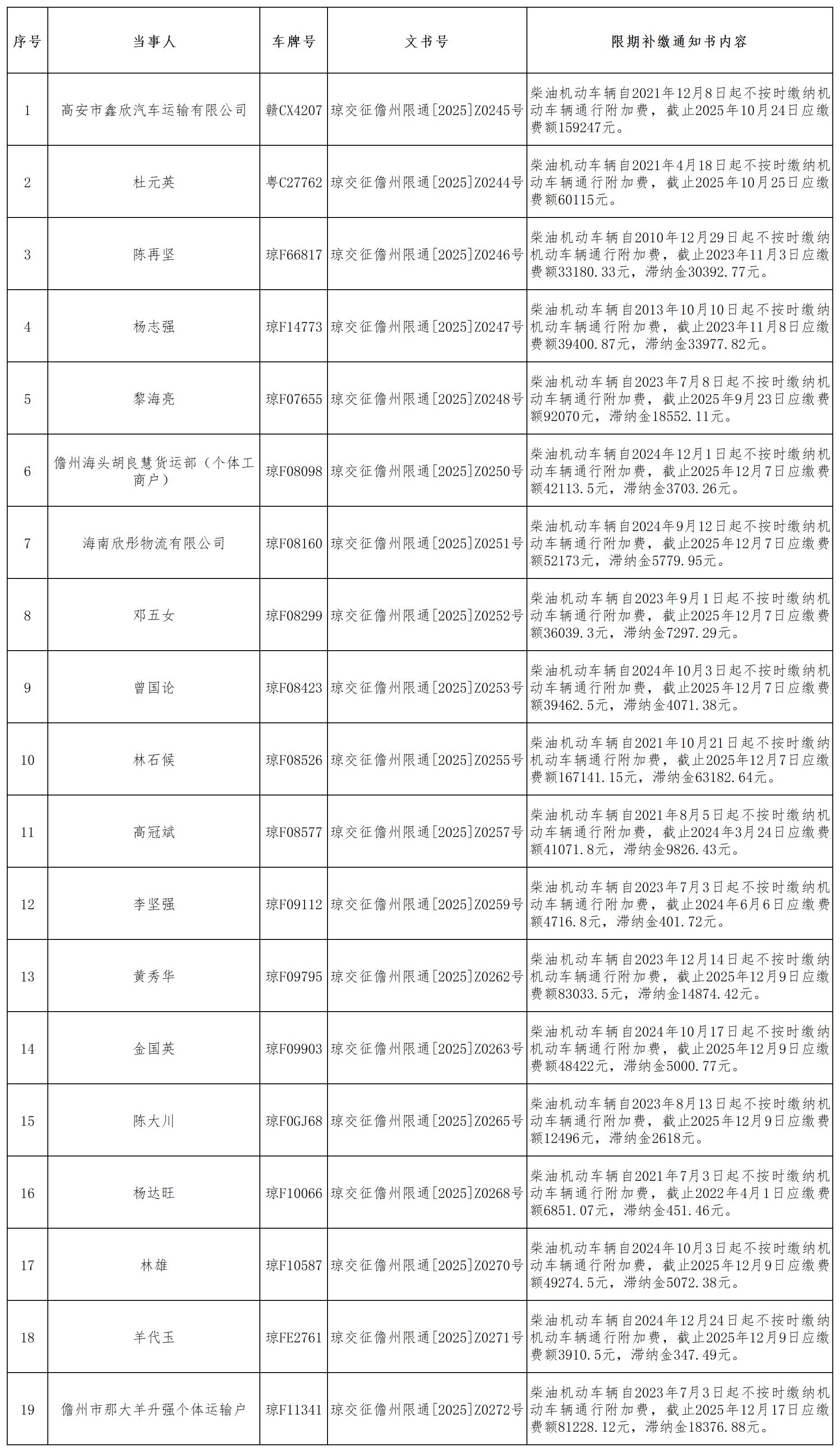 因下列违法行为人存在连续不按时缴纳机动车辆通行附加费的违法事实,本机关拟依据《海南经济特区机动车辆通行附加费征收管理条例》第二十六条之规定对其责令补缴决定。为此,本机关向下列违法行为人作出《限期补缴通知书》,依法告知拟作出责令补缴的内容及事实、理由、依据,并依法告知当事人享有的陈述、申辩以及要求听证等权利。现因采取其他方式无法向下列违法行为人送达《限期补缴通知书》,本机关特依法进行公告送达,自公告之日起经过30日即视为送达。