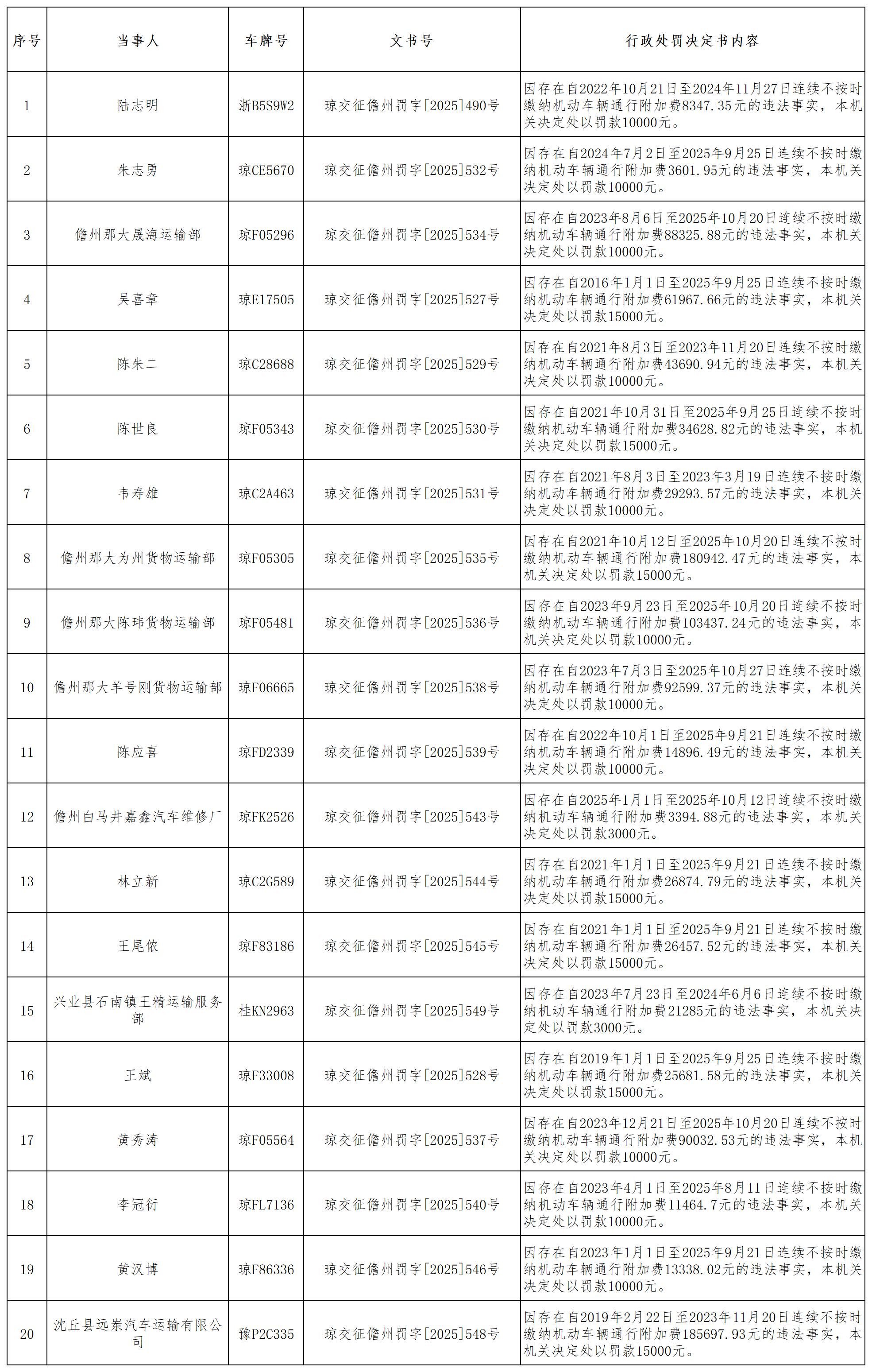 因下列违法行为人存在连续不按时缴纳机动车辆通行附加费的违法事实,本机关拟依据《海南经济特区机动车辆通行附加费征收管理条例》第二十六条之规定对其作出行政处罚决定和责令补缴决定。为此,本机关向下列违法行为人作出《违法行为通知书》,依法告知拟作出行政处罚和责令补缴的内容及事实、理由、依据,并依法告知当事人享有的陈述、申辩以及要求听证等权利。现因采取其他方式无法向下列违法行为人送达《违法行为通知书》,本机关特依法进行公告送达,自公告之日起经过30日即视为送达。
