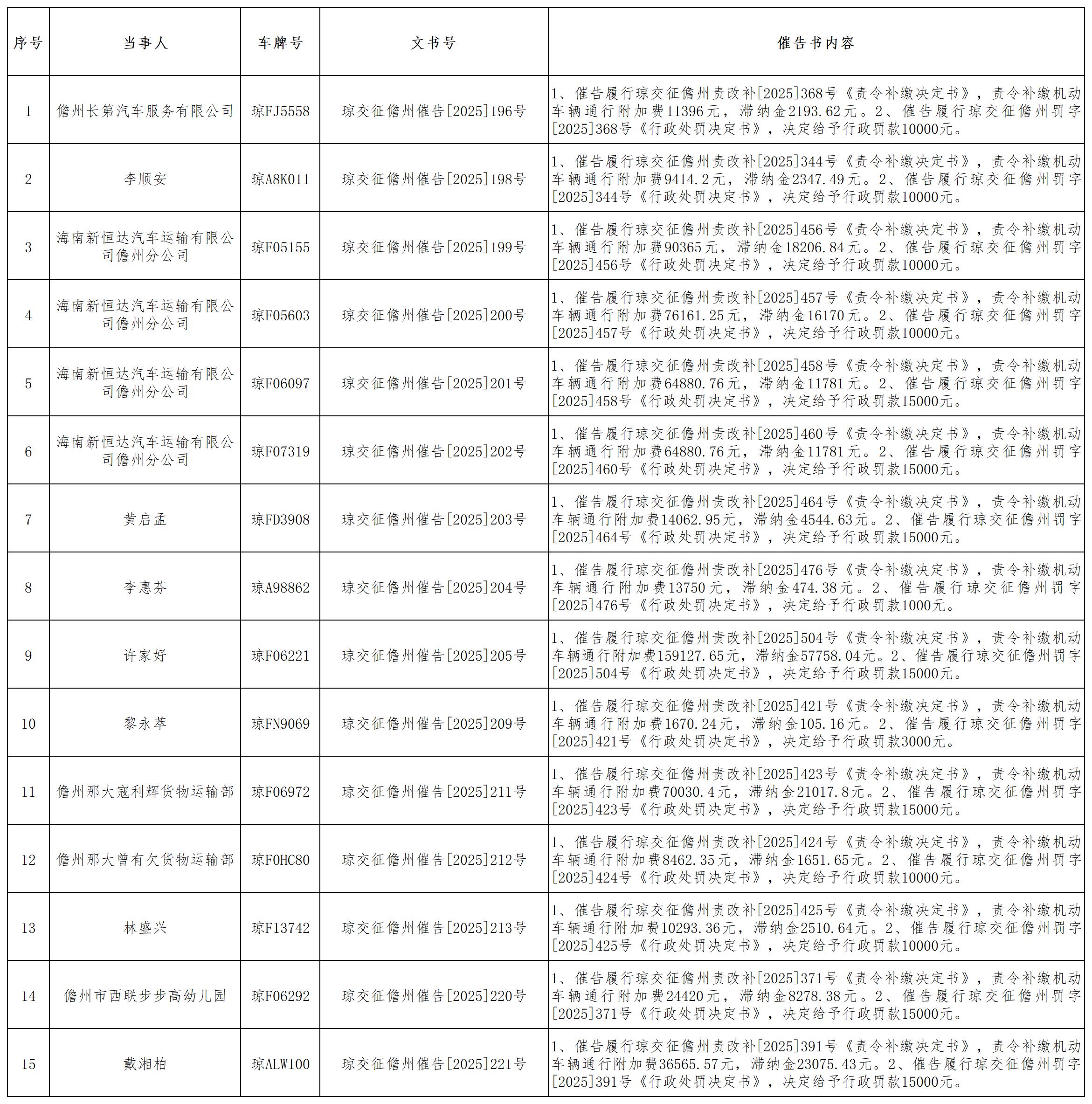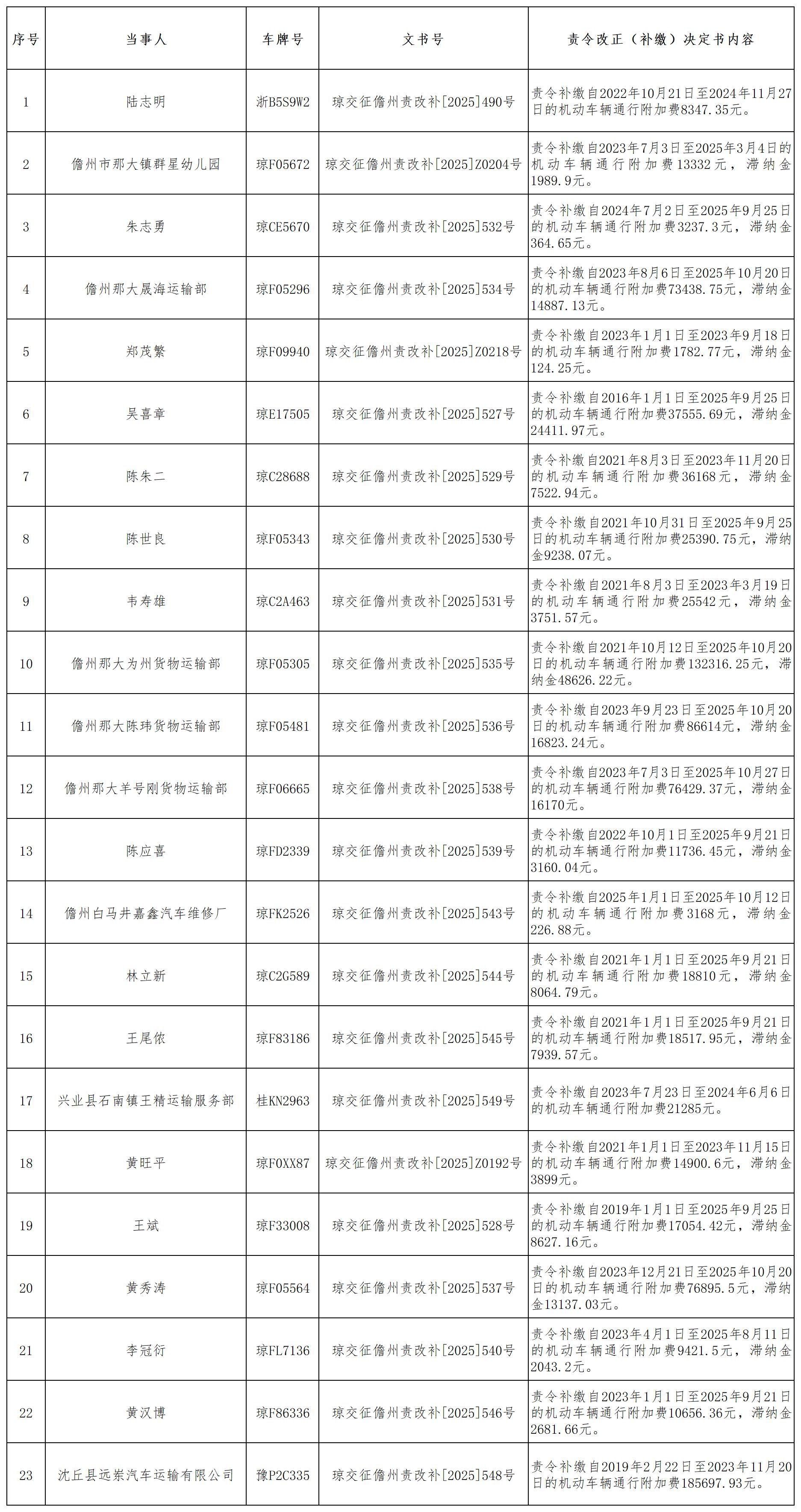 因下列当事人存在不按时缴纳机动车辆通行附加费的违法事实,依据《海南经济特区机动车辆通行附加费征收管理条例》第二十六条之规定,本机关已对其作出《责令改正(补缴)决定书》,责令其补缴应缴纳的机动车辆通行附加费及滞纳金。现因采取其他方式无法向下列当事人送达《责令改正(补缴)决定书》,本机关特依法进行公告送达,自公告之日起经过30日即视为送达。请下列当事人自决定书送达之日起十五日内到我分局进行缴款。当事人如不服决定书的,可自送达之日起六十日内向海南省人民政府申请行政复议,或者自送达之日起六个月内向人民法院提起行政诉讼,但决定书不停止执行,法律另有规定的除外。逾期不申请行政复议或不提起行政诉讼,又不履行决定书的,本机关将依法申请人民法院强制执行。