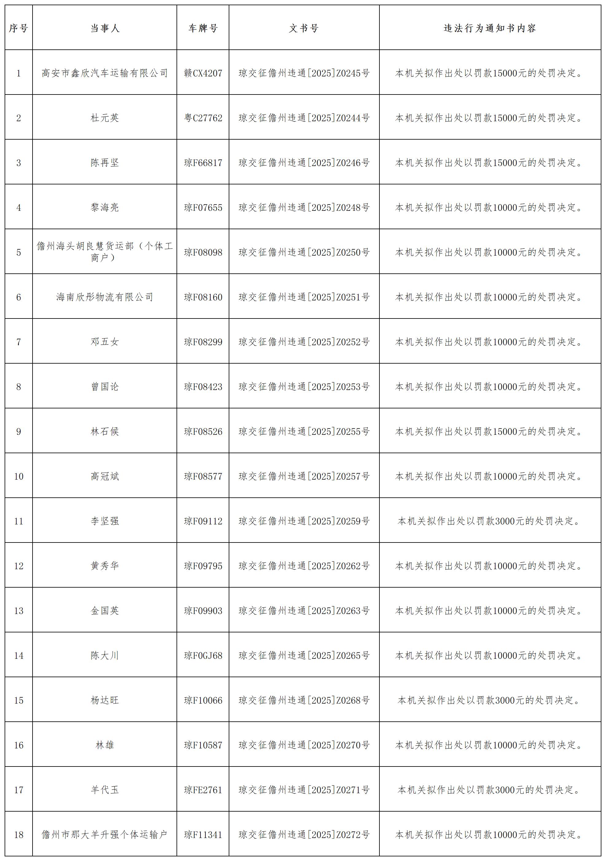 海南省交通规费征稽局儋州分局关于送达《违法行为通知书》的公告
