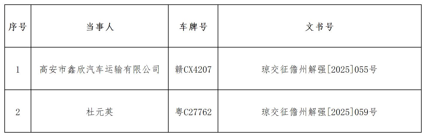 海南省交通规费征稽局儋州分局关于送达《解除行政强制措施决定书》的公告