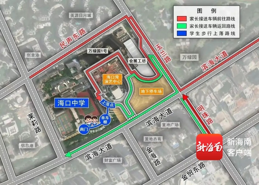 学生步行上落路线:海口中学南门→单车棚→临时上落点。