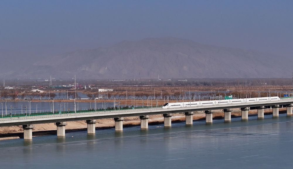2025年12月23日,包银高铁首发列车D4667次动车组行驶在石嘴山境内。新华社记者 王鹏 摄
