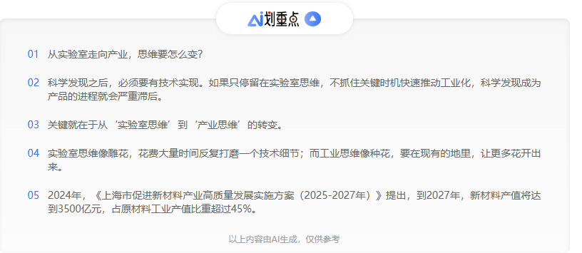 正是这一个接一个成功实现产业化转型的企业,为上海的发展注入了信心。2024年,《上海市促进新材料产业高质量发展实施方案(2025-2027年)》提出,到2027年,新材料产值将达到3500亿元,占原材料工业产值比重超过45%。