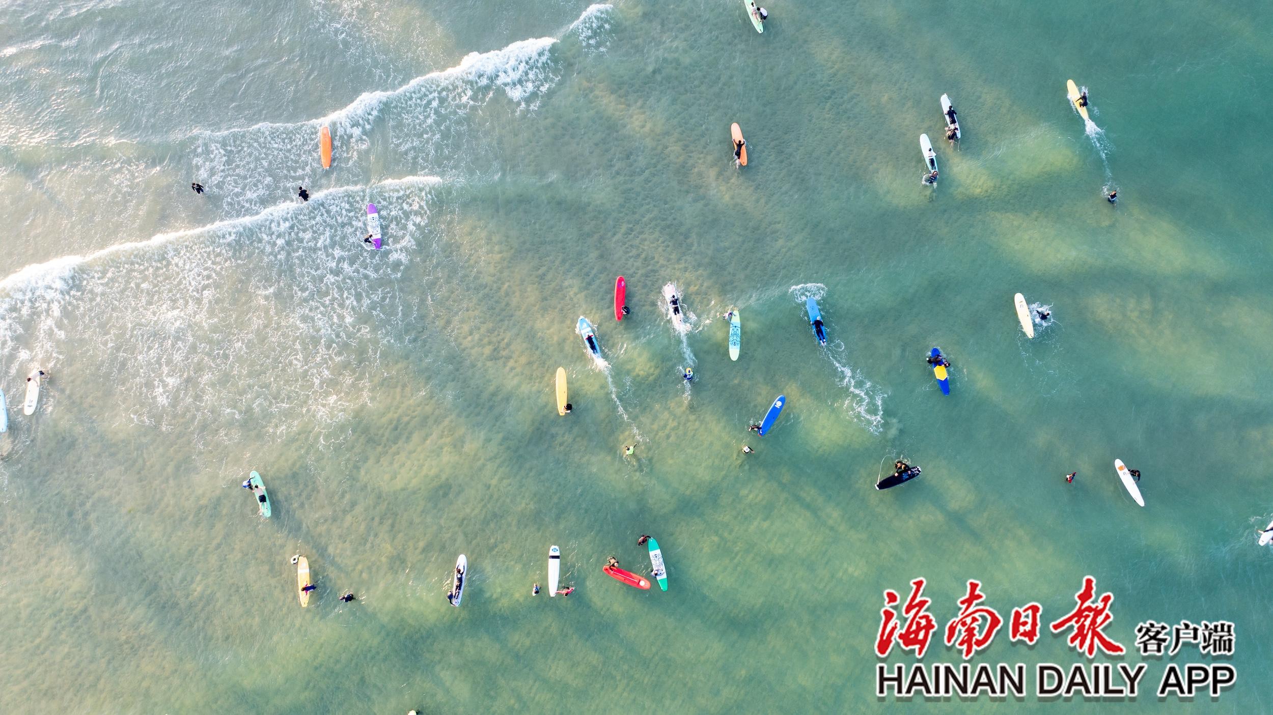 在万宁日月湾,游客们学习冲浪,享受着惬意的海边生活。海南日报全媒体记者 袁琛 摄