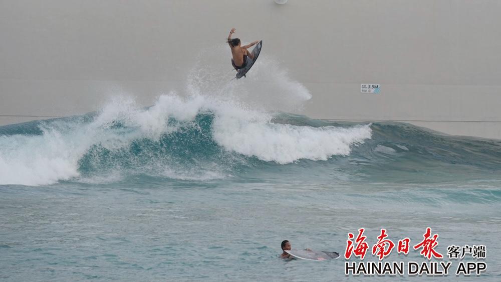 造浪机轰鸣,池水翻滚。一道接一道的人工浪被精确制造出来,最高可达2.7米。距其数百米,便是国内最佳冲浪地之一——万宁日月湾。不过,即便在以浪好闻名的日月湾,这样高度且持续不断的浪形,也很少见。