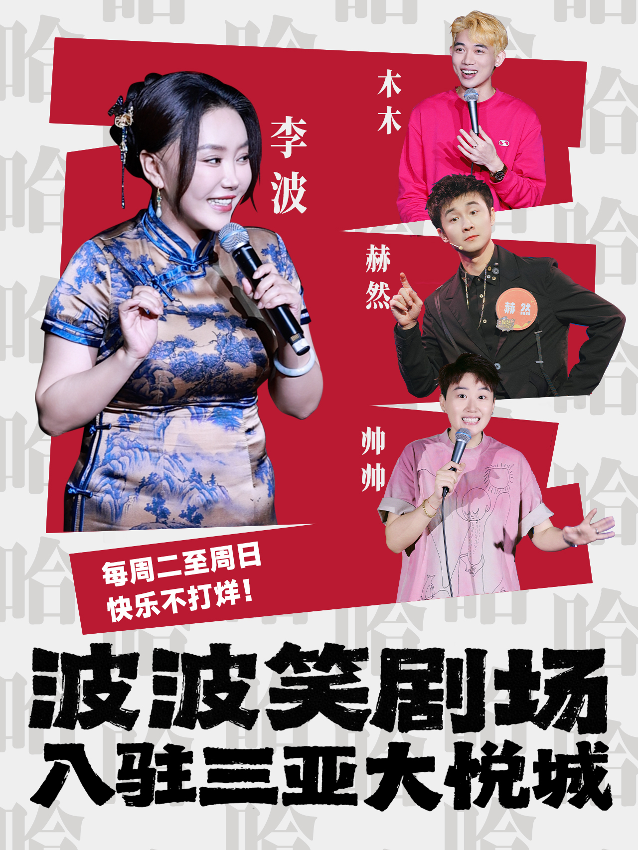 自2025年12月25日起,每晚19:00,波波笑剧场在三亚大悦城(L6-02)持续呈现90分钟精彩演出,创始人李波携手房主任、莹莹、帅帅、赫然、大头、大树、木木等脱口秀演员轮番登台,为市民与游客奉上“日落看海、夜晚看脱口秀”的三亚式文化生活新选择。