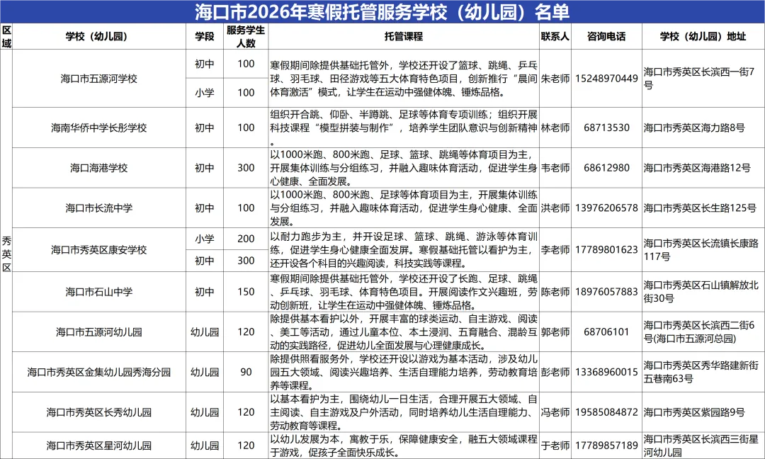 今年寒假,海口共有32所学校开放托管服务,提供托管学位6145个。各托管学校在落实基本看护责任的基础上,精心规划课程安排,广泛开设了体育、阅读、劳动、科技等多样化课程。既为学生提供妥善照护,也通过丰富的素质拓展活动满足其假期多元需求,助力学生度过充实有意义的寒假。