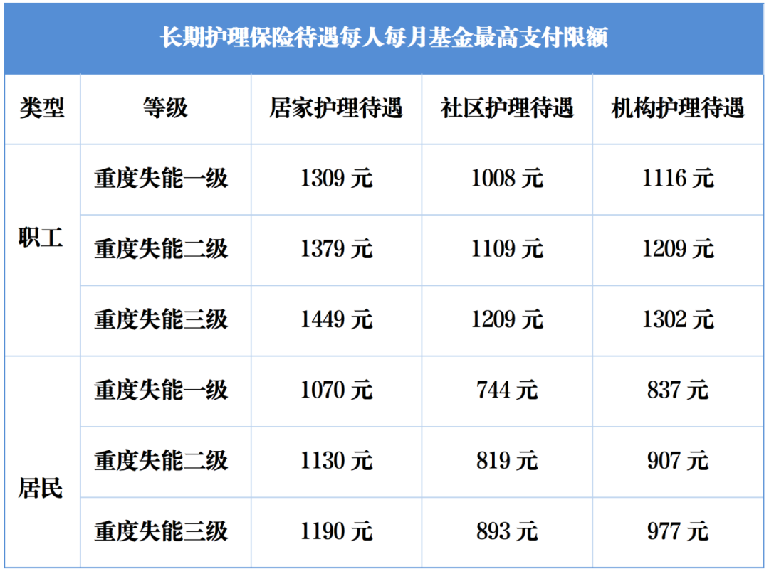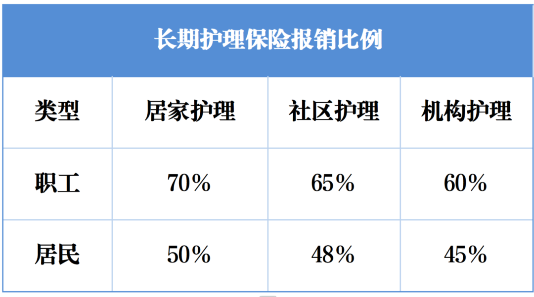 根据护理机构类型,职工参保人符合规定的护理费用,基金支付比例约60%至70%,城乡居民参保人约45%至50%,其中居家和社区护理服务的支付比例会适当倾斜。
