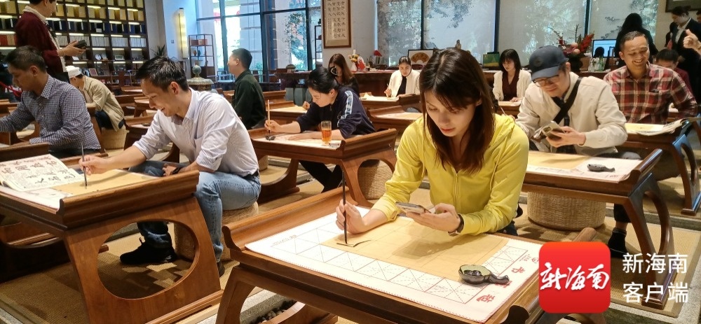 图为2024年,中国(海南)-东盟旅文推广活动,国际考察团的嘉宾们在博鳌乐城康养机构体验中国书法文化。记者 王康景 摄
