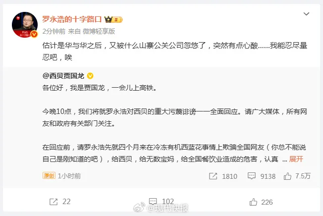 1月16日,@贾国龙微博发文表示今晚10点将开播就罗永浩对西贝的重大污蔑诽谤一一全面回应表示:各位好,我是贾国龙,一会儿上高铁。今晚10点,我们将就罗永浩对西贝的重大污蔑诽谤一一全面回应。请广大媒体,所有网友和政府有关部关注。在回应前,请罗永浩先就四个月来在冷冻有机西蓝花事情上欺骗全国网友(你总不能说自己是刚知道的吧),给西贝,给无数宝妈,给全国餐饮业造成的危害,认真道歉,并赔偿相应损失。
