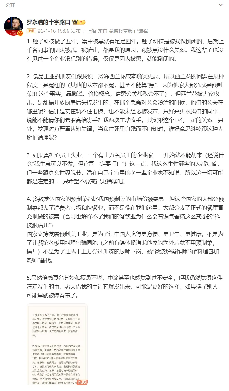据津云新闻,就贾国龙在朋友圈发文证实西贝计划关闭102家门店一事,罗永浩1月16日下午在其个人社媒账号发布长文回应:1. 锤子科技做了五年,集中被黑就有足足四年。锤子科技是被我做倒闭的,后期上千名同事的团队被裁、被转让,都是我的原因,跟被黑没什么关系。我这辈子也没有见过一个企业没犯别的错误,仅仅是因为被黑,就能倒闭的。