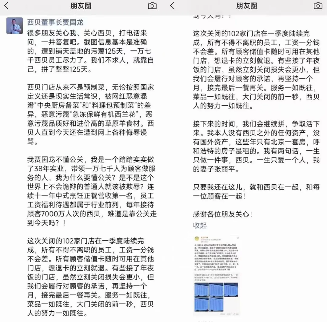 贾国龙称自己不懂公关,只是一个踏踏实实做了38年实业,带领一万七千人为顾客做服务的人,他在文中写道:“这次关闭的102家门店在一季度陆续完成,所有不得不离职的员工,工资一分钱不会差,所有顾客储值卡随时可用在其他门店,想退卡的立刻就退,有些接了年夜饭的门店,虽然立刻关闭损失会更小,但我们会履行对顾客的承诺,再坚持一个月,接完最后一餐再关。服务一如既往,菜品一如既往,大门关闭的前一秒,西贝人的努力一如既往。”