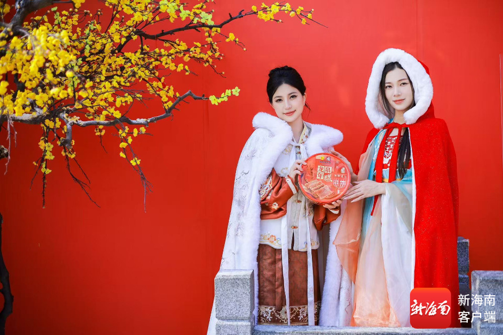 除了吃吃喝喝,友谊・南海城还精心打造了国风园林场景,朱红墙瓦错落有致,梅枝斜倚暗香浮动,氛围感拉满!不少市民游客前往6F友谊荟租借汉服或披风,穿上古装在园景中漫步拍照;不少年轻人一边拍照一边打卡线上话题,共同分享这份独特的琼味国风体验。