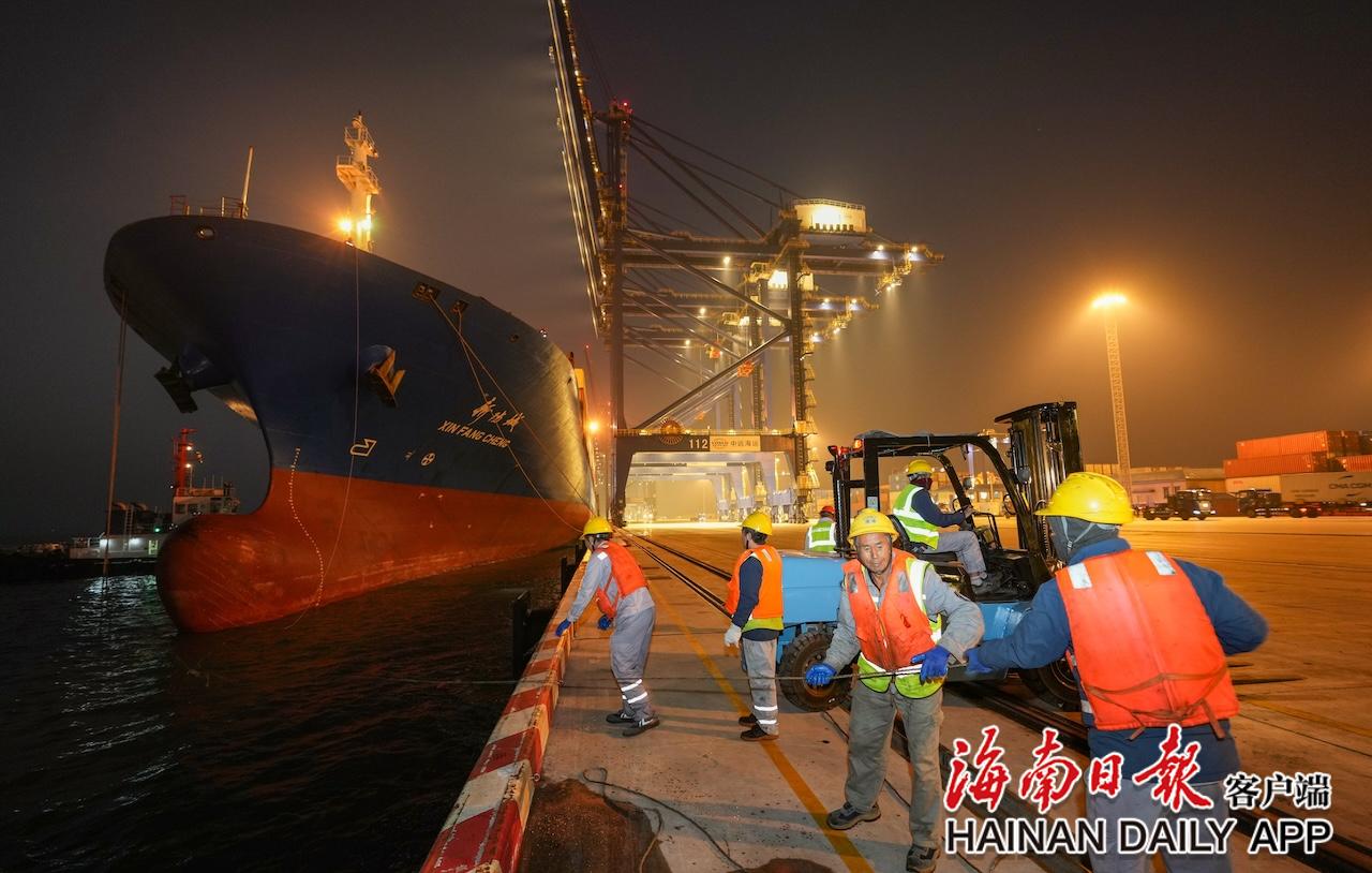 2025年12月18日清晨,洋浦国际集装箱码头灯火通明,当日第一艘集装箱轮船“新防城”号缓缓驶入港区并平稳停泊。