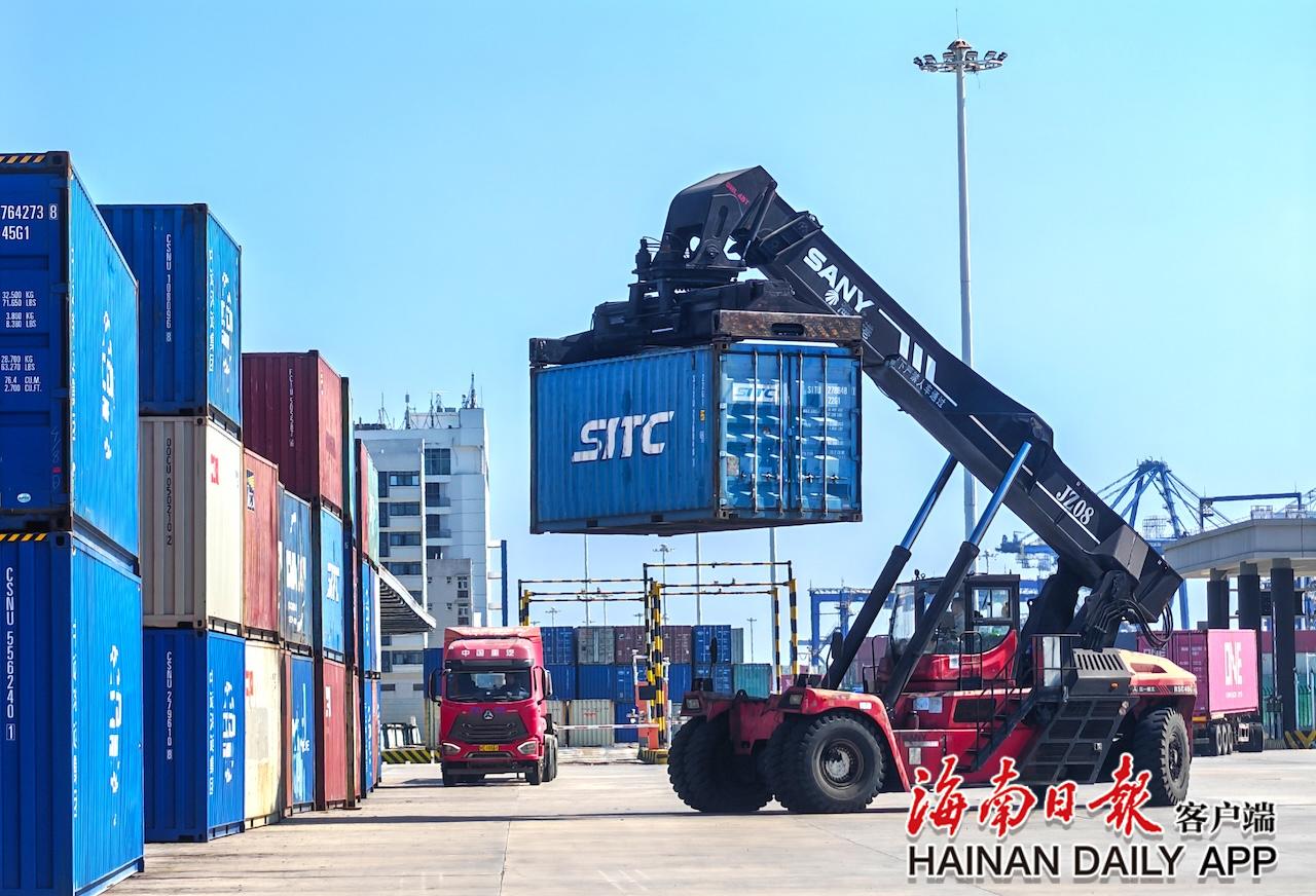 2026年1月8日,在洋浦港口岸集装箱集中查验场地内,工作人员有序转运集装箱,口岸作业繁忙而高效。