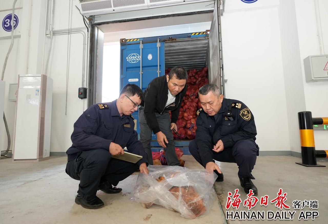2026年1月8日,在洋浦港口岸集装箱集中查验场地内,海关工作人员为进出口货物办理通关手续。