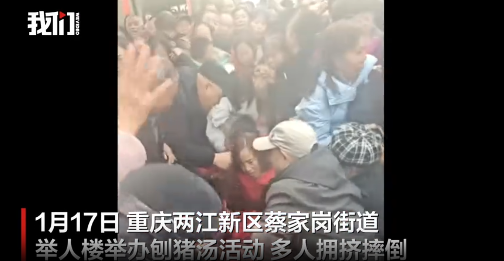 据新京报报道,1月17日,重庆两江新区蔡家岗街道举人楼举办“刨猪汤”活动,现场人员聚集拥挤,发生多人摔倒情况。