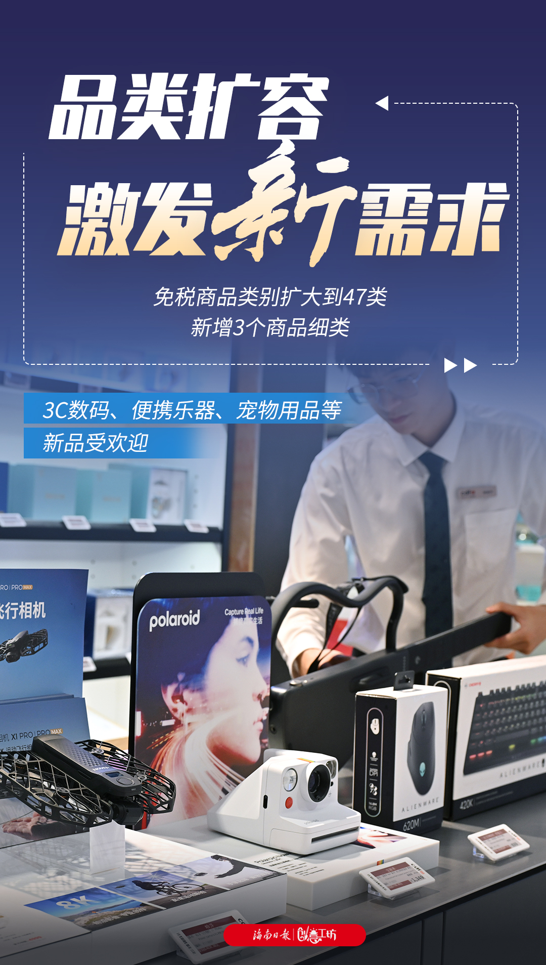 海南日报全媒体记者在走访中注意到,海口、三亚、万宁等地免税店还开设了新品专区,专门打造“新政快闪店”,集中展示新增品类和优惠活动,方便大家快速了解、轻松选购。