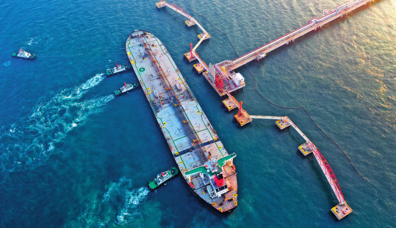 图为一艘装载着17.9万吨石化原辅料的船舶泊入国投洋浦油储码头30万吨级原油泊位。这是海南自由贸易港正式启动全岛封关后洋浦港口岸第一批通关的“零关税”石化原辅料(2025年12月18日摄)郭程摄 /《瞭望》新闻周刊