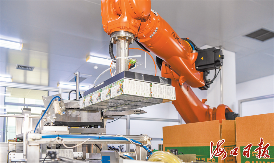 在海南亚洲制药股份有限公司,智能化机械臂挥动“手臂”搬运产品。海口市融媒体中心记者 康登淋 摄