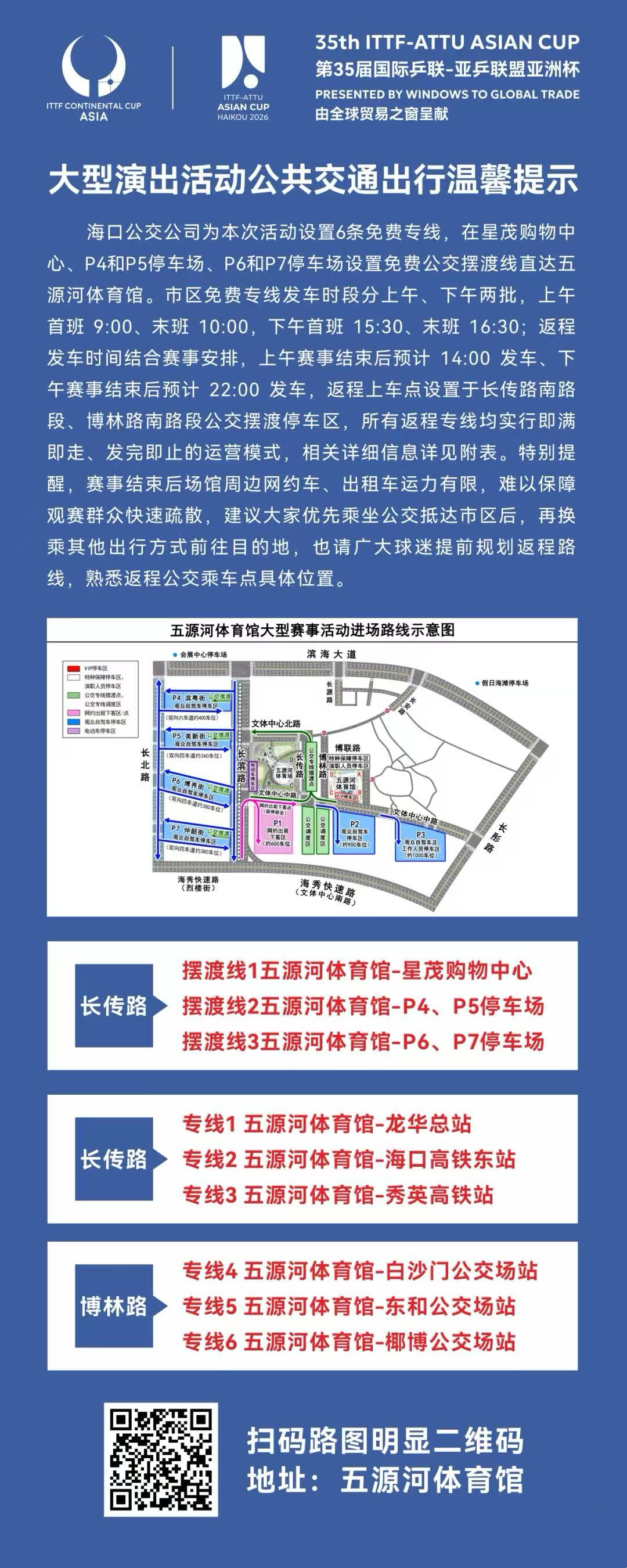 海口市已成立多部门联动的赛事保障体系,安排6条观众接驳线路,统筹调度200余台车辆保障运力,方便观众往返场馆与市区。